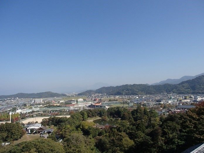 天守に入り、天守から北の方角を眺めた。 森の向こうの広大な平原は、城の建てられた当時は琵琶湖の内海だった。 遥か向こうに山脈がありその一部が途切れているが、琵琶湖から途切れている場所を抜け..
