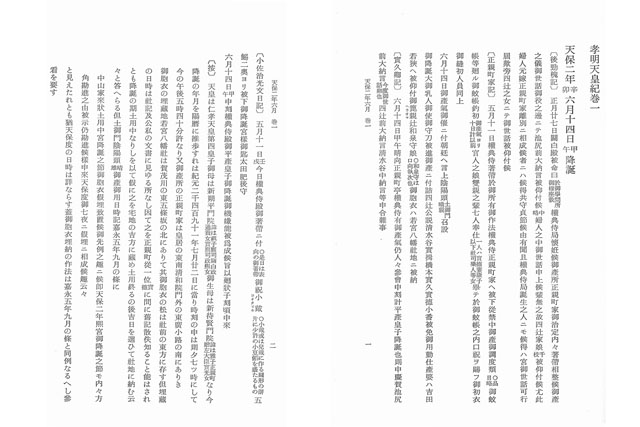 孝明天皇紀 第1 孝明天皇紀 巻1 1頁 天保二年辛卯六月十四日甲午 降誕 「孝明天皇紀」は天保2年(1831)6月14日の降誕より始まり、慶応2年(1866)12月29日の崩御までの36年..