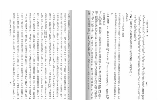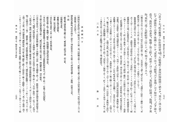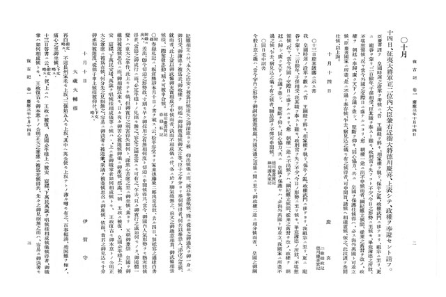 復古記 第1冊 復古記 第1冊 2頁 慶応三年十月十四日の条 十四日、征夷大将軍正二位内大臣兼右近衛大将軍徳川慶喜、上表シテ、政権を奉還セント請フ。 復古記は慶応3年(1867)10月14..