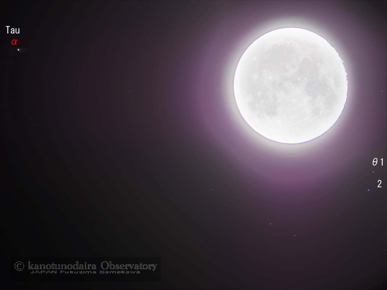 スーパー十六夜(笑)の大きな月がヒアデス星団の中にあります。α(アルデバラン)が肉眼でも見えていますが光芒に埋もれそうです。 画像クリックでAstroArtsに アルデバランが月の明る..