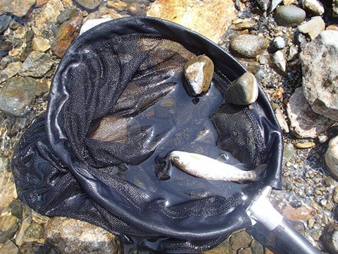 続いて2匹目が、すぐ釣れた。 小石を置いて、後で何匹目か区別がつくようにして撮影し、すぐリリースした。夢中になって釣っている間に、いよいよ森は深くなっていく。熊の影に怯えながら、減水気味の..
