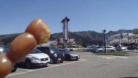 これから、「幸せ三点セット」の時間となるが、今日の主役はあくまでも満開の桜の花である。 からしをいっぱいつけてもらった玉コンニャクの向こうには、国道49号線沿いに咲き誇った満開の桜並木が見え..