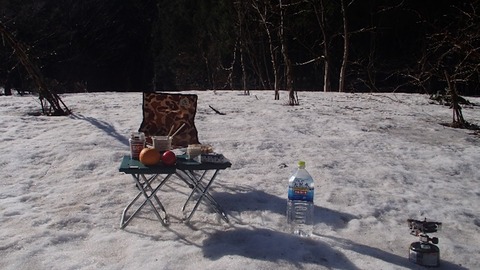 昼食は千刈集落から百数十m程度離れたカラキ沢の入り口にした。 桜満開の山のお祭りの季節に、まだまだ残雪の残っている場所で朝食を食べるのも面白いと思ったからである。 朝食のメニューは、..