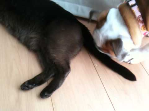 どうしてノーチェがまったく遊んでやらずに、たまこをぶったかというと……。 その前に、暖かい床で気持ちよ~く昼寝していたところを、叩き起こされ、よりによって股間を舐め回され..