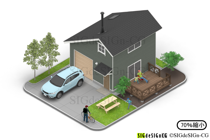 [アイソメ30] 住宅風景-ガレージ木造2台用カントリーテイスト 背景透過PNG 3DCGイラスト商用画像