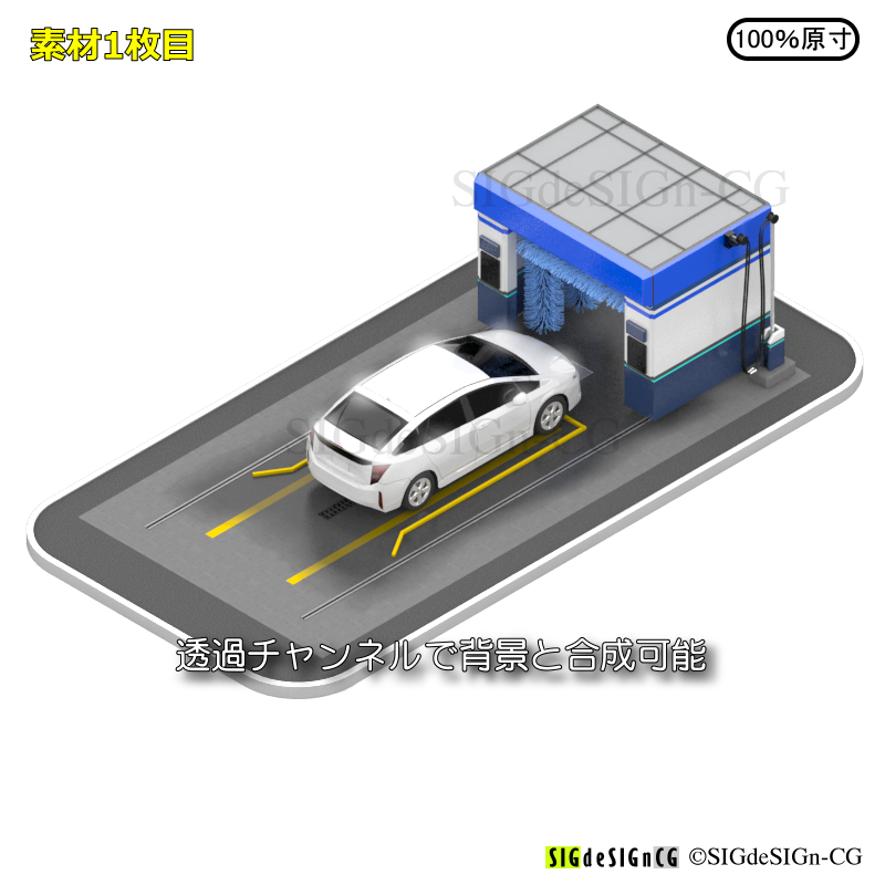 ギャラリーショップ詳細をみる アイソメトリック図法を用いた、PNG透過マップ仕様の、 洗車機の一連シーンです。 一般的な門型自動洗車機で、 洗車前の汚れた状態から洗車中、洗車後の輝..